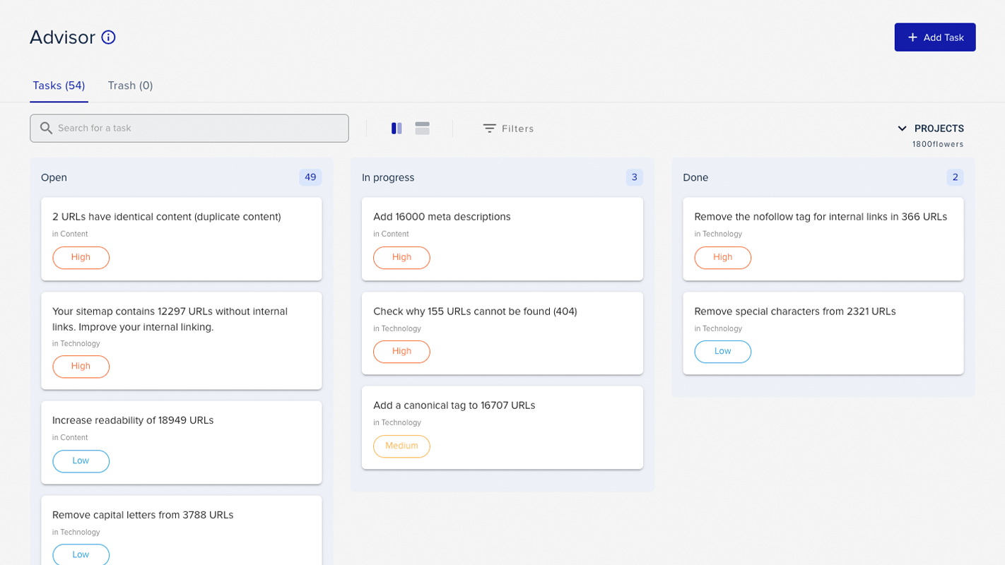 Keep in mind that you do need a Project for the Advisor feature to work. Also, most of the Advisor's tasks are tailored to a Project's website (usually yours or your client's). If you manage more than one website, you'll need to create an extra Project for each of them.